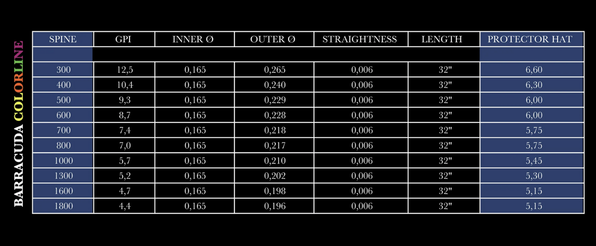 De Barracuda Colorline carbon pijlschachten zijn verkrijgbaar in tien rugwaarden (300-1800), geschikt voor elke boogmaat en treklengte. Ze zijn extreem dun (Ø 5-6,5 mm, afhankelijk van de spine) en bijzonder sterk dankzij hun dikke wanden.