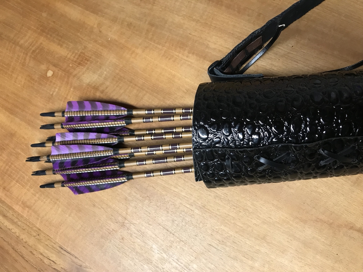 Hij is 52cm hoog en grootste diameter is 11cm en goed voor zo'n 20-25 pijlen.